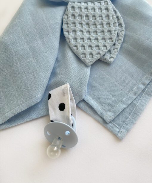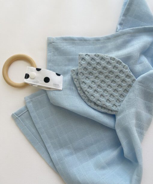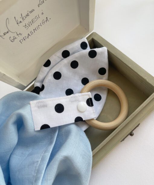 Muslino migdukas – mažylio draugas, švelnus ir malonus prisiglausti, o ausytes labai smagu pakramsnoti, kai ima kutenti dygstantys dantukai. Vietoje medinio žiedelio galima prisegti tūtuką.