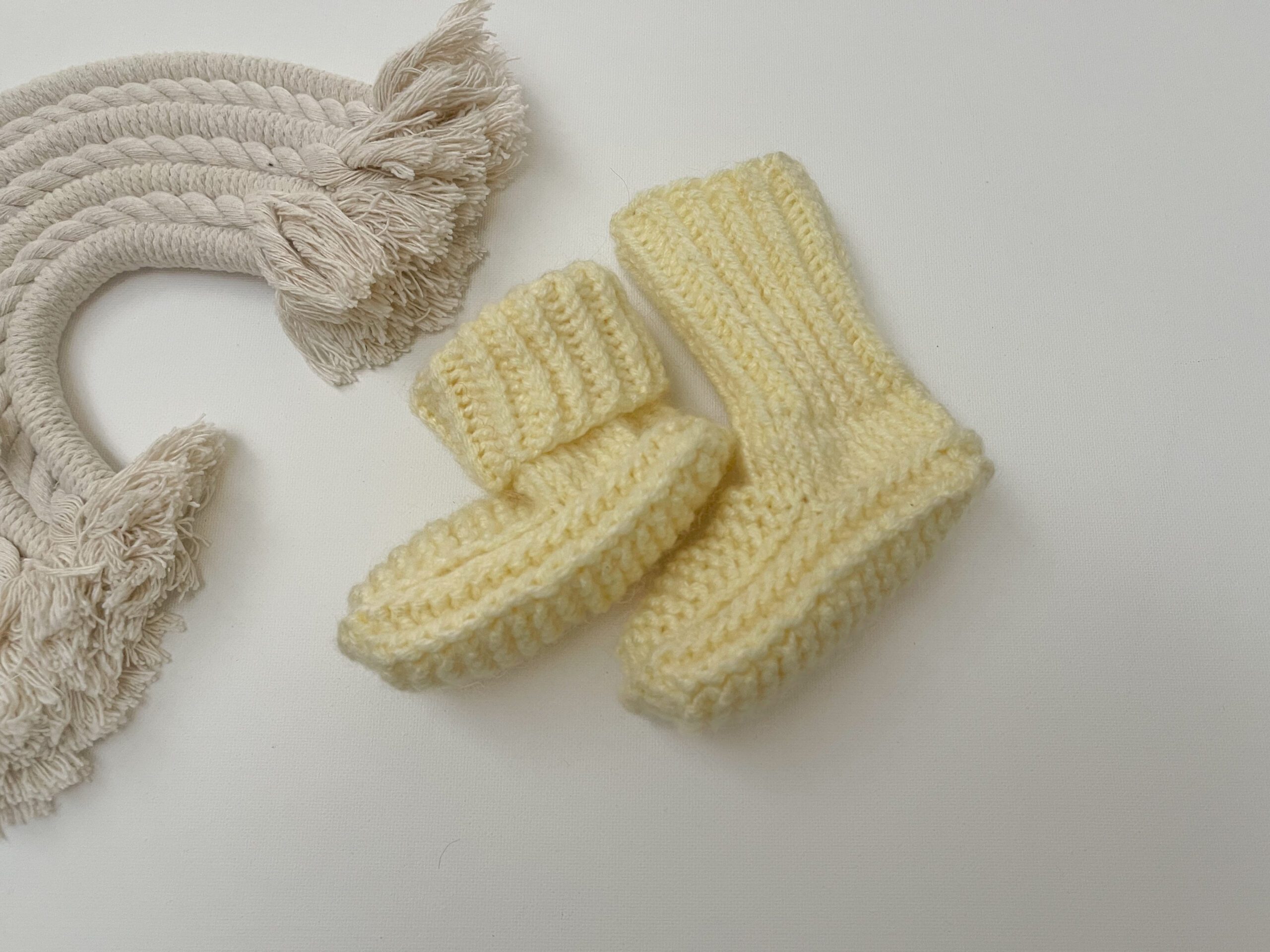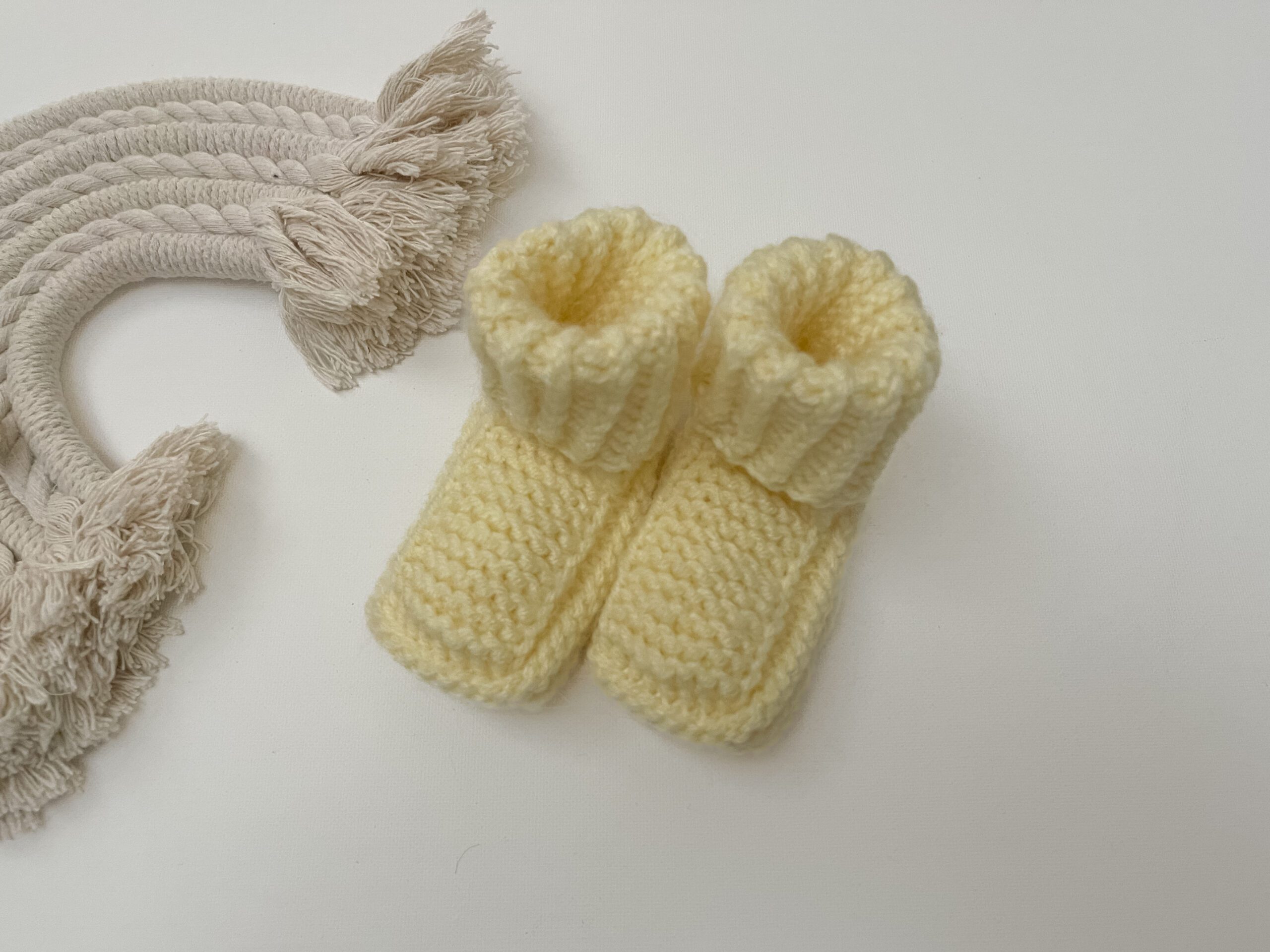 Vilnoniai tapukai naujagimiui. Megzti rankomis, šilti ir švelniai kutenantys mažylio pėdeles, skatindami kraujotaką. Pėdutės ilgis 9-10 cm, tinkami nuo 0 iki 3 mėn.