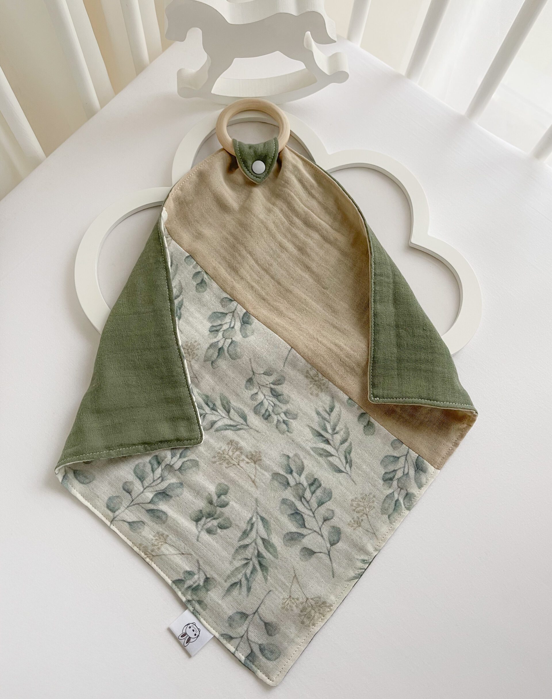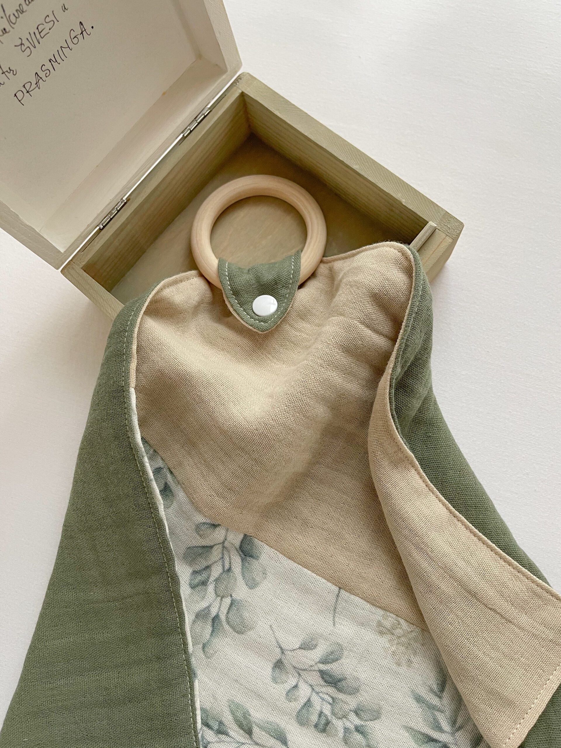 100proc. organinė medvilnė (turi OEKO-TEX® STANDARD 100 sertifikatą), natūralios medienos kramtukas