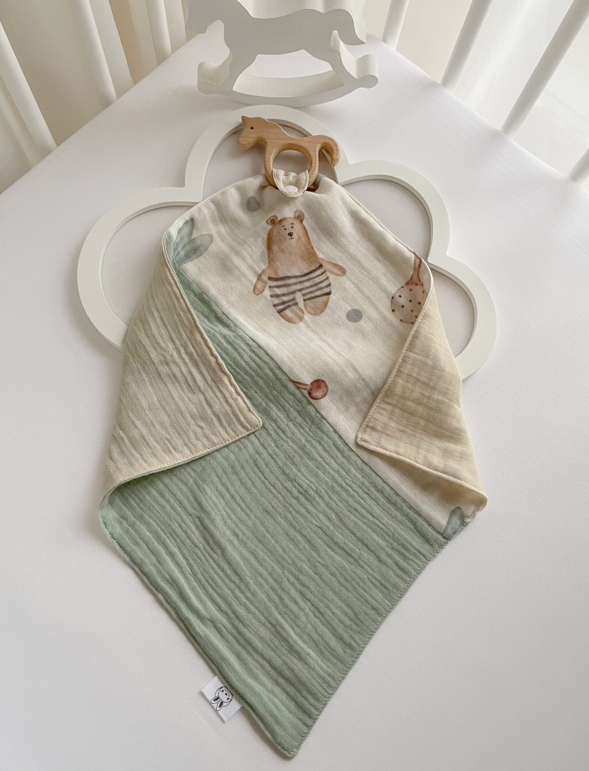 Kramtukas – merliukas, pasiūtas iš dvigubo minkštučio muslino audinio, su prisegamu mediniu kramtuku. Vietoje medinio kramtuko galima prisegti tūtuką arba kitą mėgiamą žaisliuką.