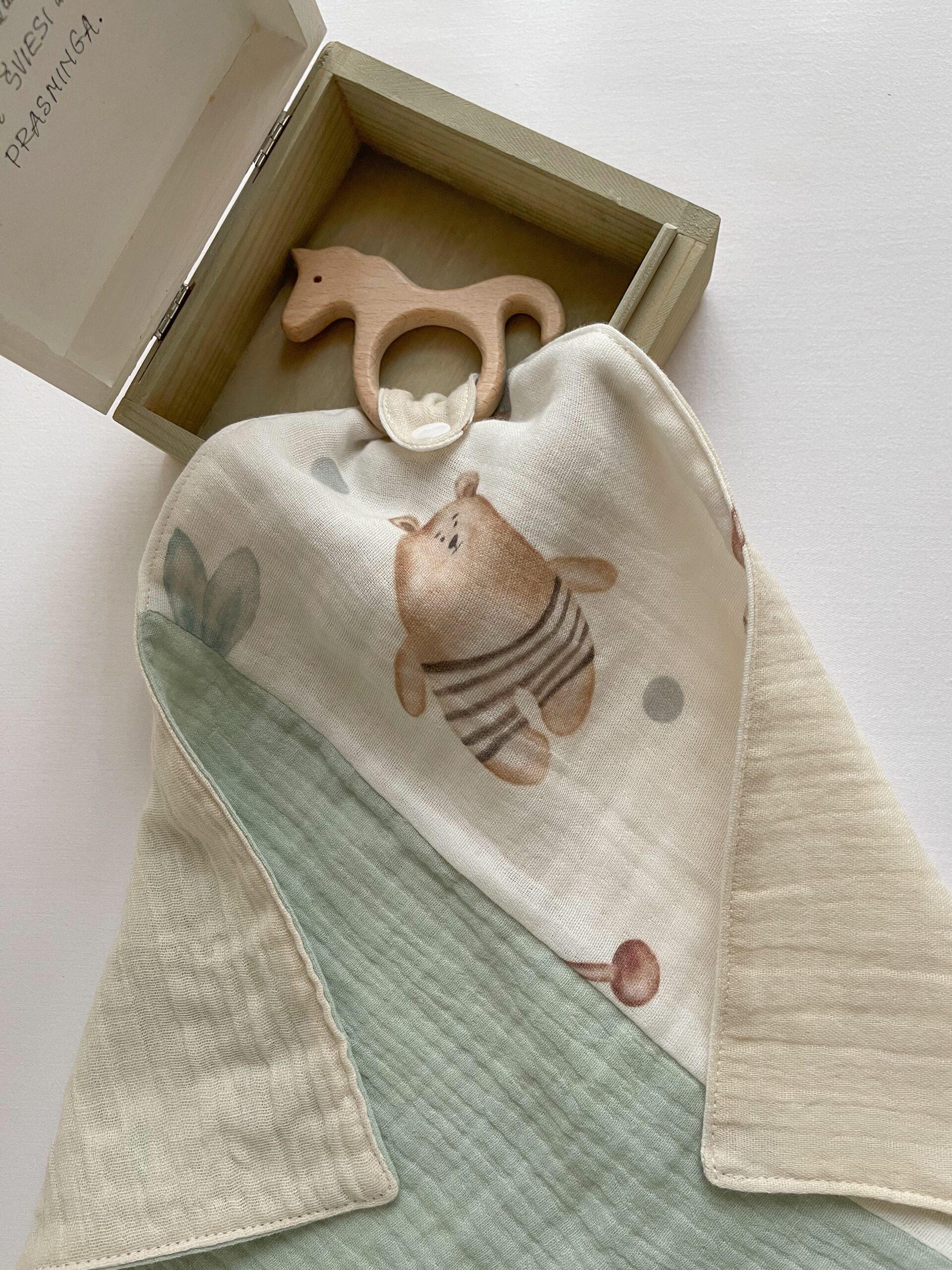 100proc. medvilnė (turi OEKO-TEX® STANDARD 100 sertifikatą), natūralios medienos kramtukas