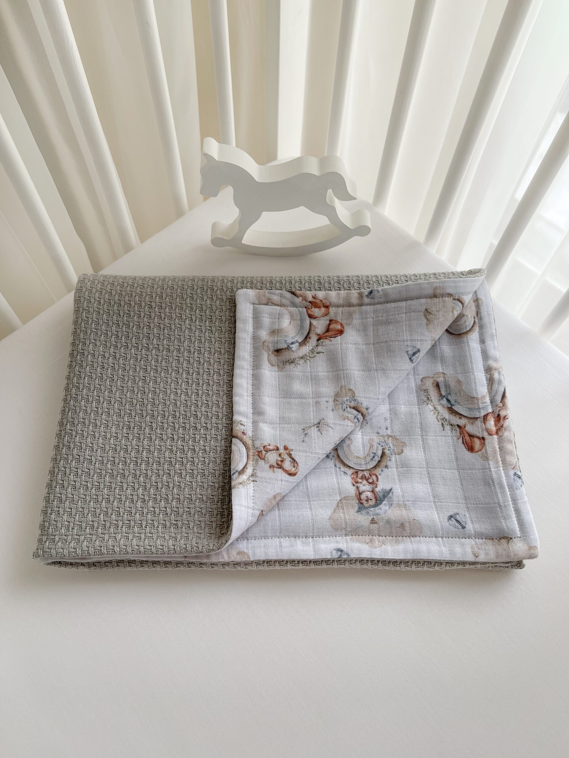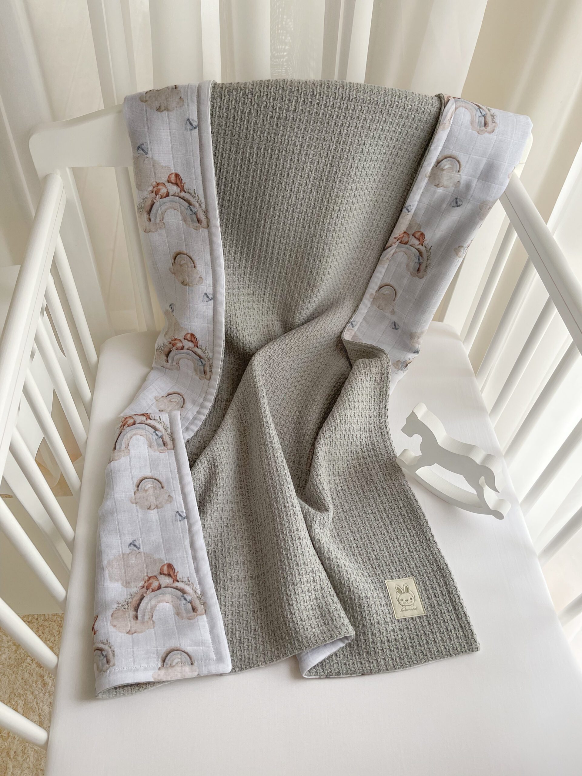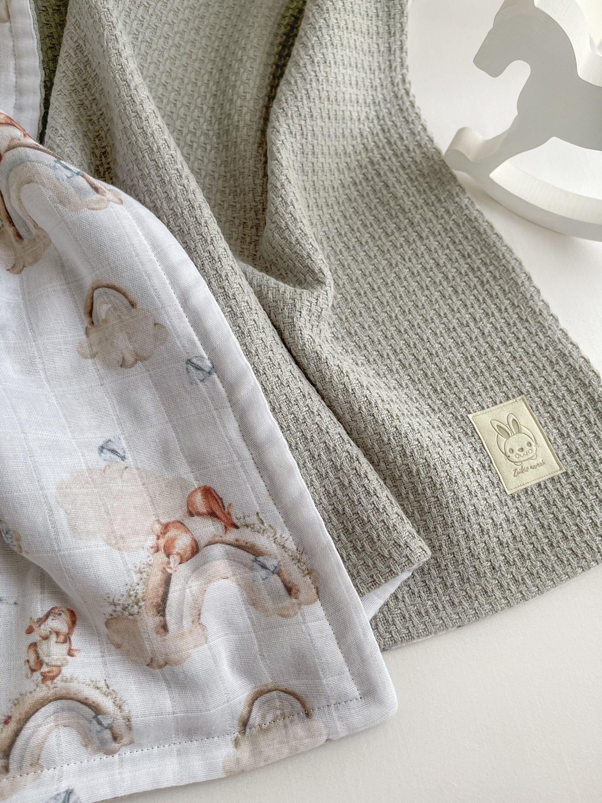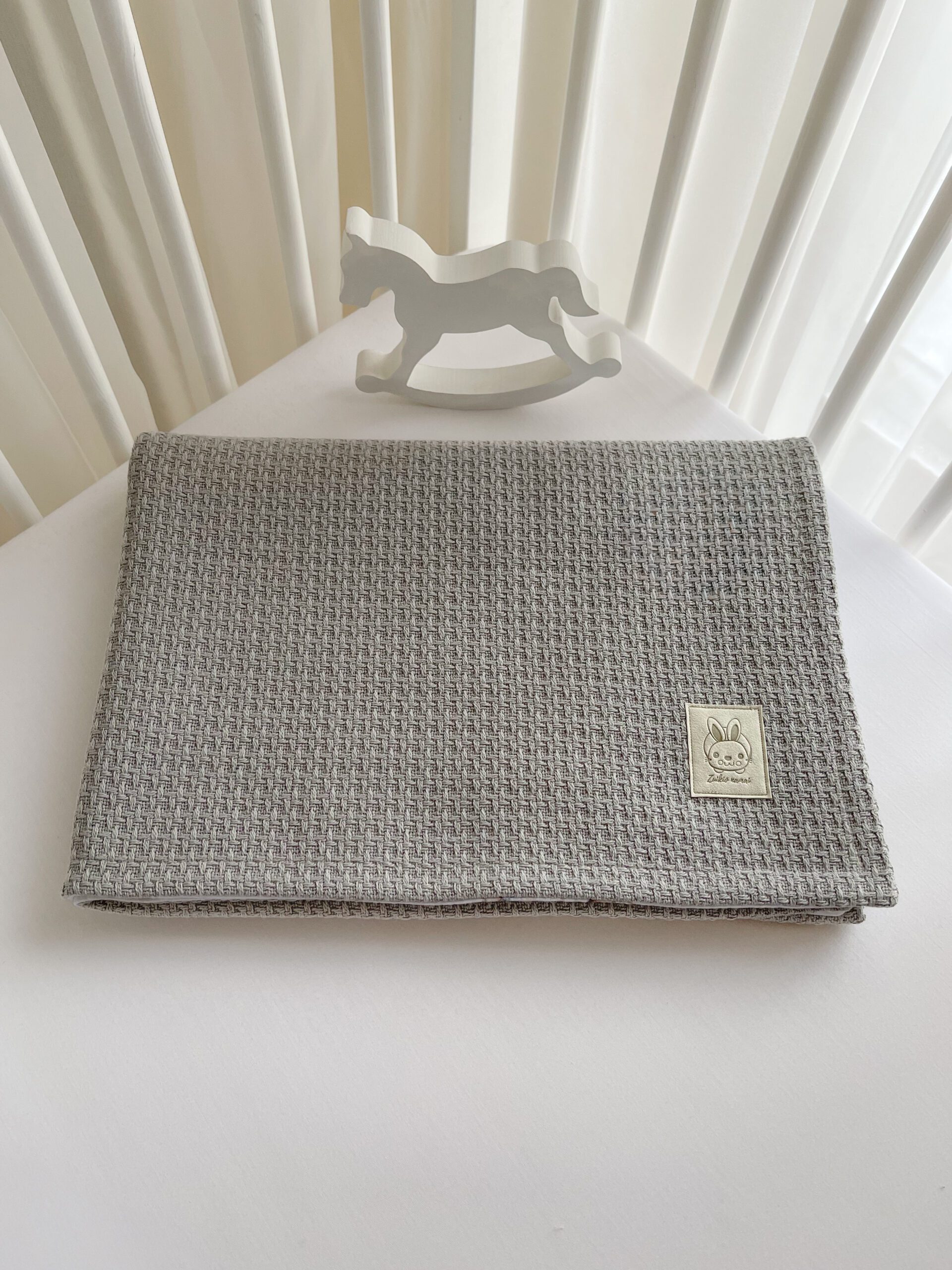 Šis, langeliais austas, muslino audinys nėra garintas, todėl po plovimo (nelyginant audinio) įgaus „banguotą” muslino vaizdą ir taps vis minkštesnis.