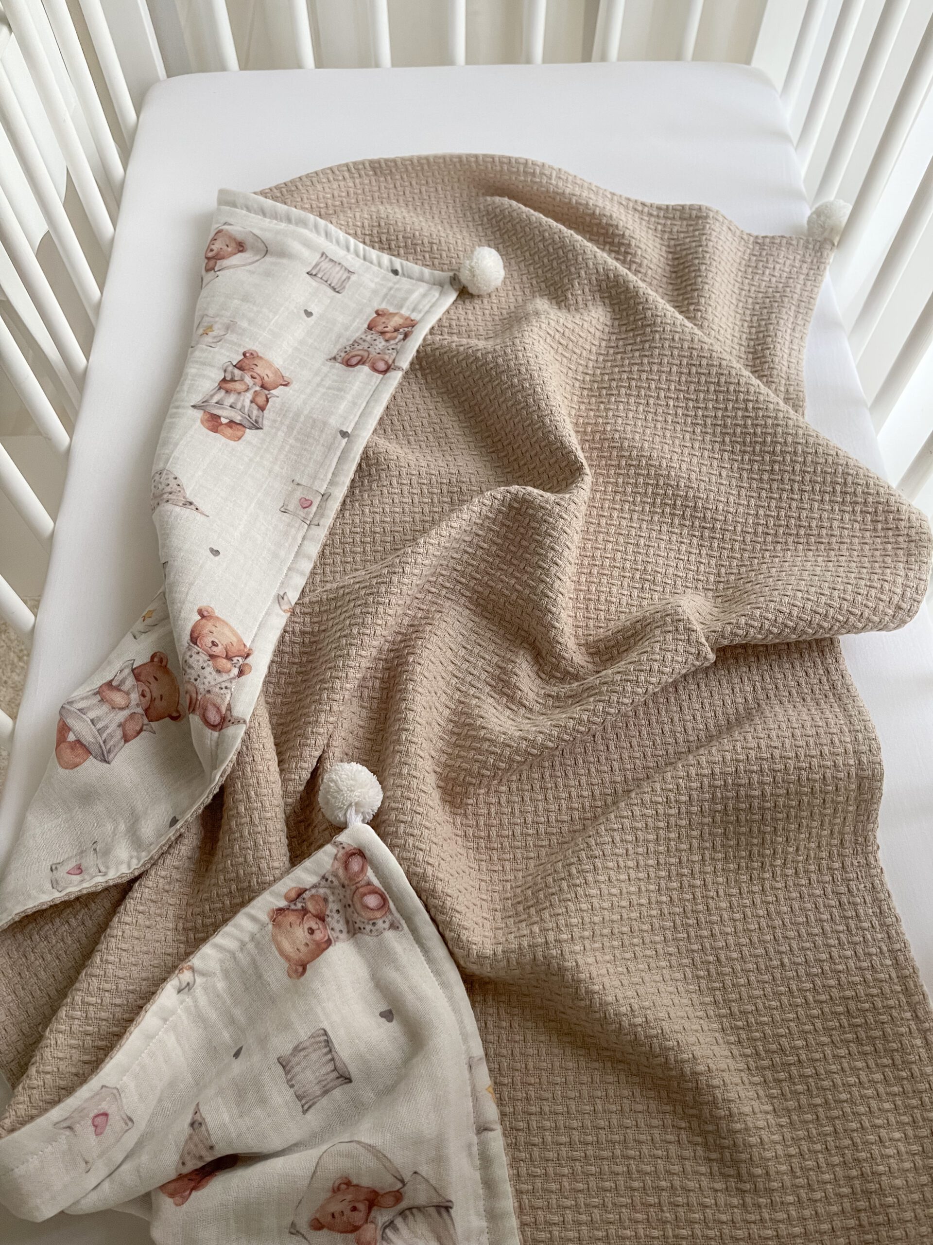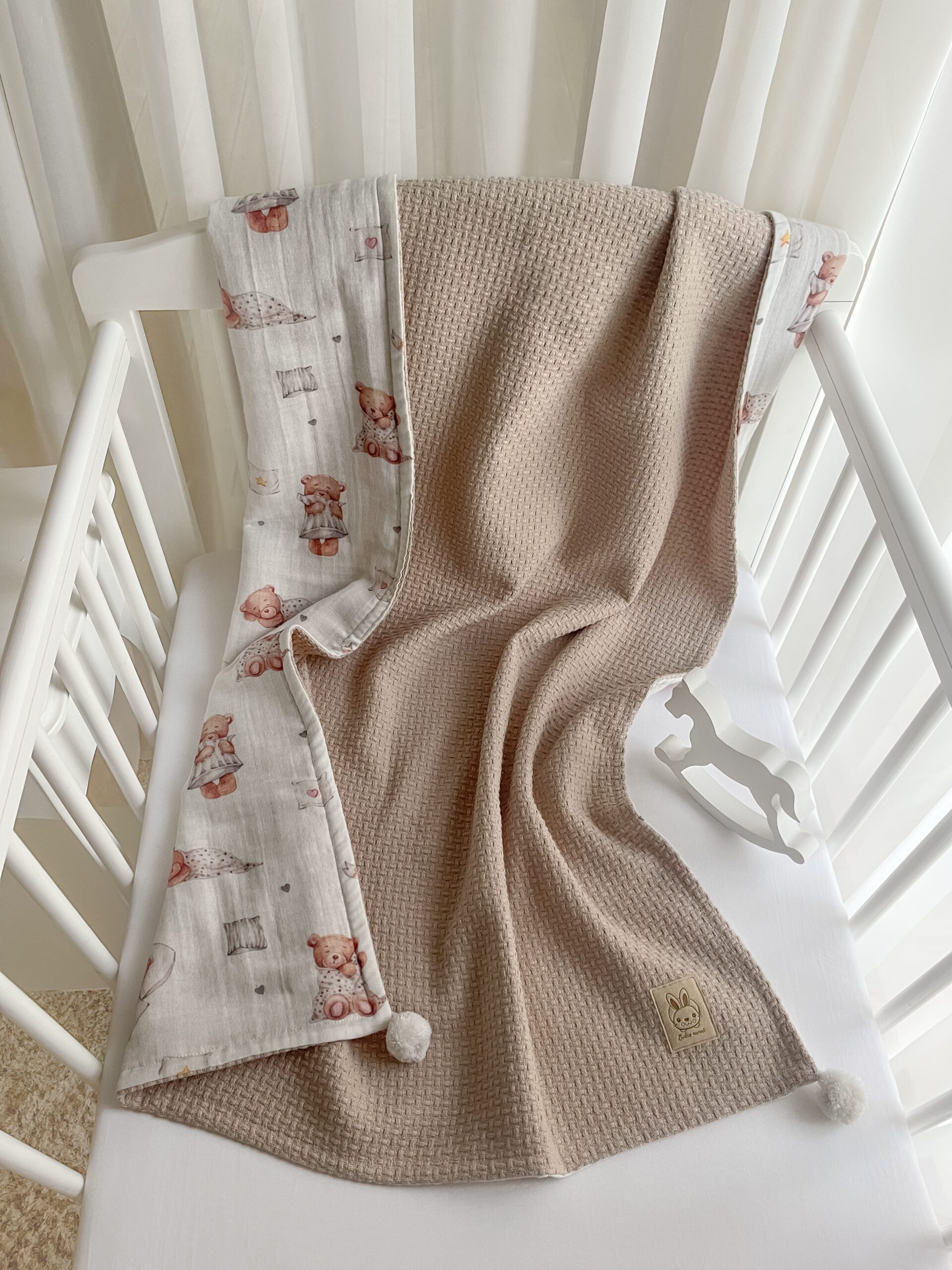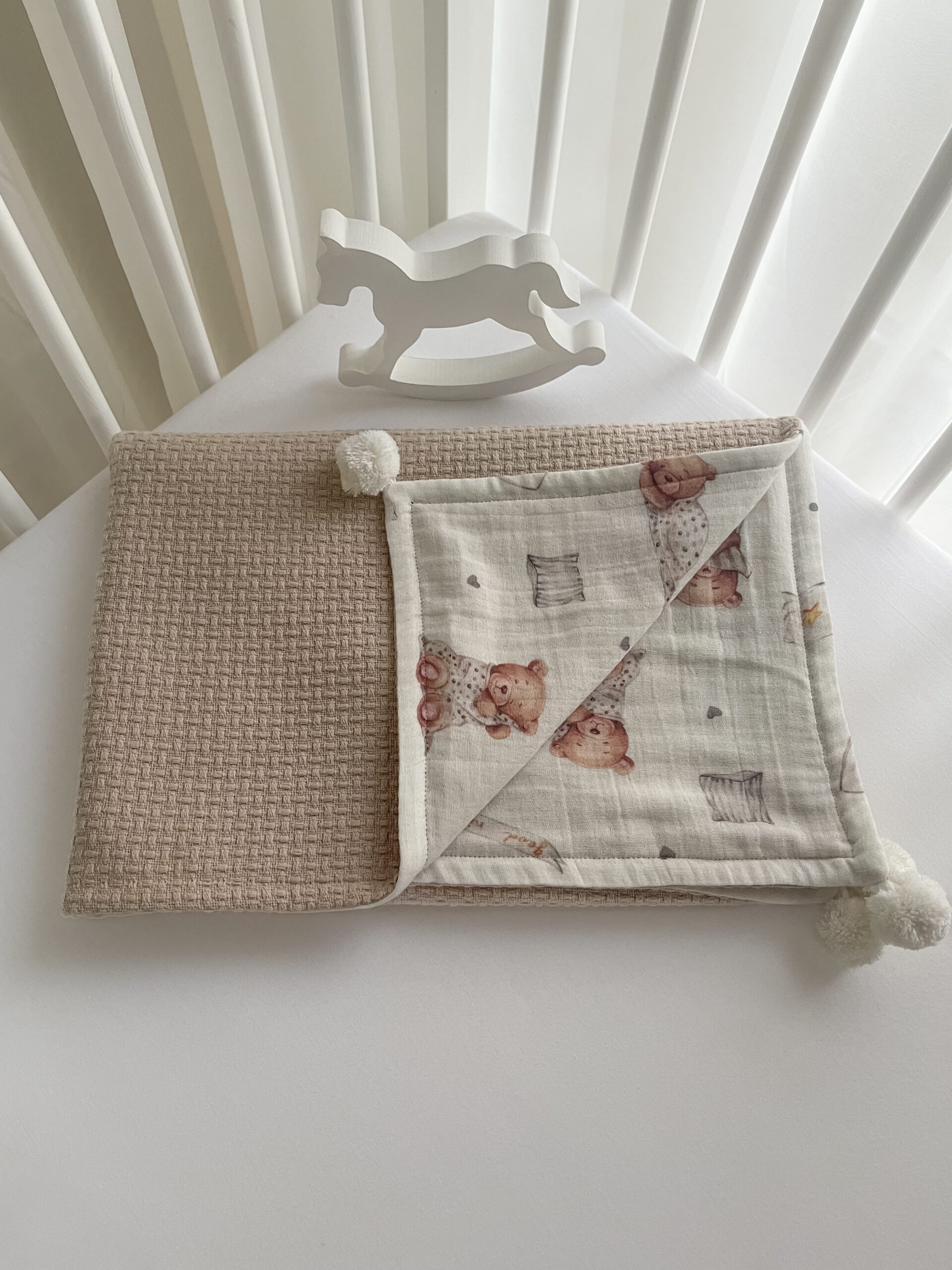 Pledukas iš raštuotos medvilnės – švelnaus muslino. Kampučiuose puoštas baltais pom-pom burbuliukais. Dydis 80x110cm (+-2cm). Spalva: šviesi smėlio / kreminė su meškučių raštais.