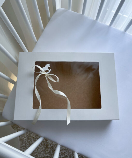 Paskutinėje nuotraukoje pateikiamas pakuotės dovanai pavyzdys, juostelių ir arkliuko spalva gali skirtis, o dėžutės forma (stačiakampė ar kvadratinė) parenkama pagal gaminio dydį.